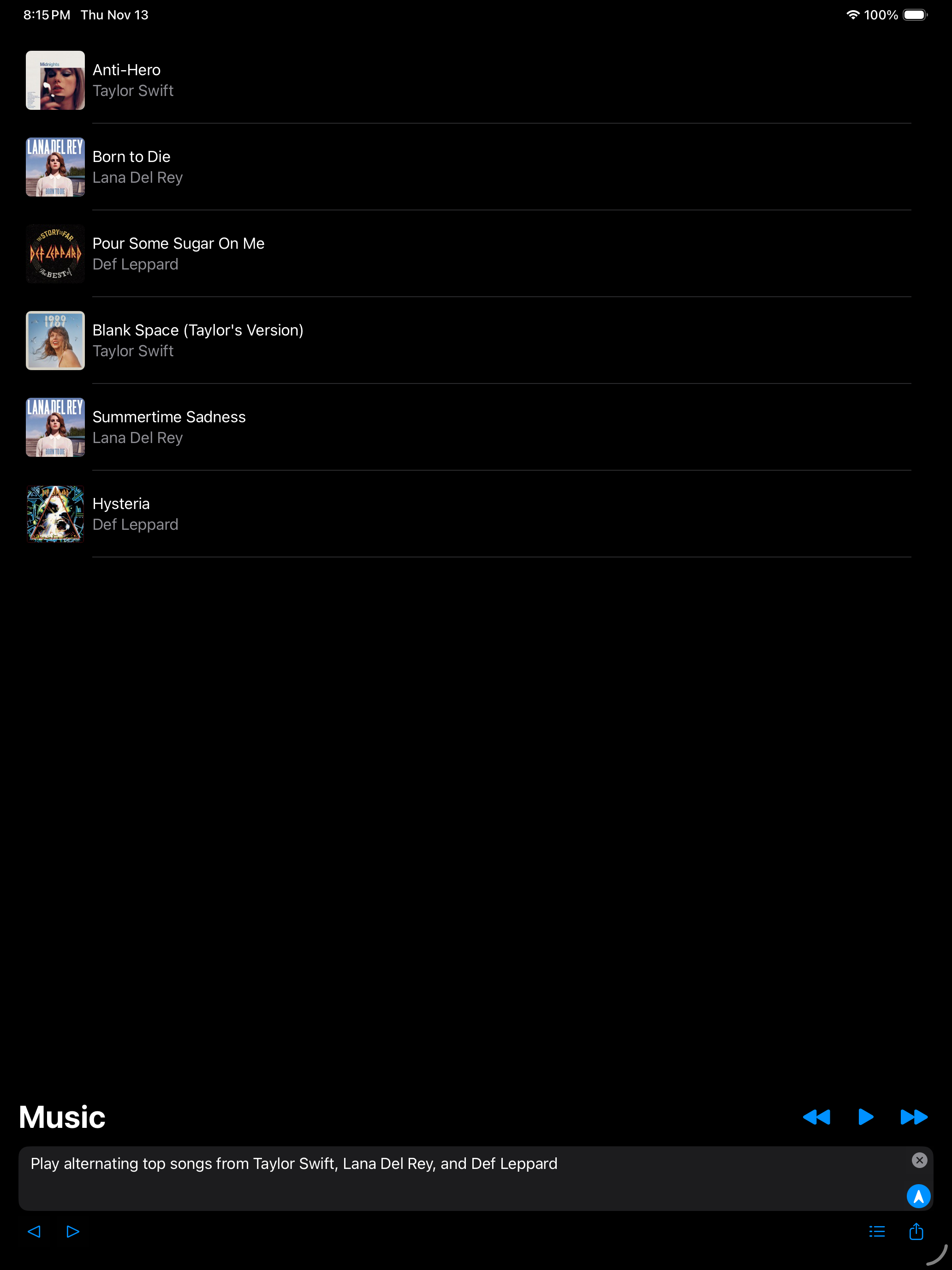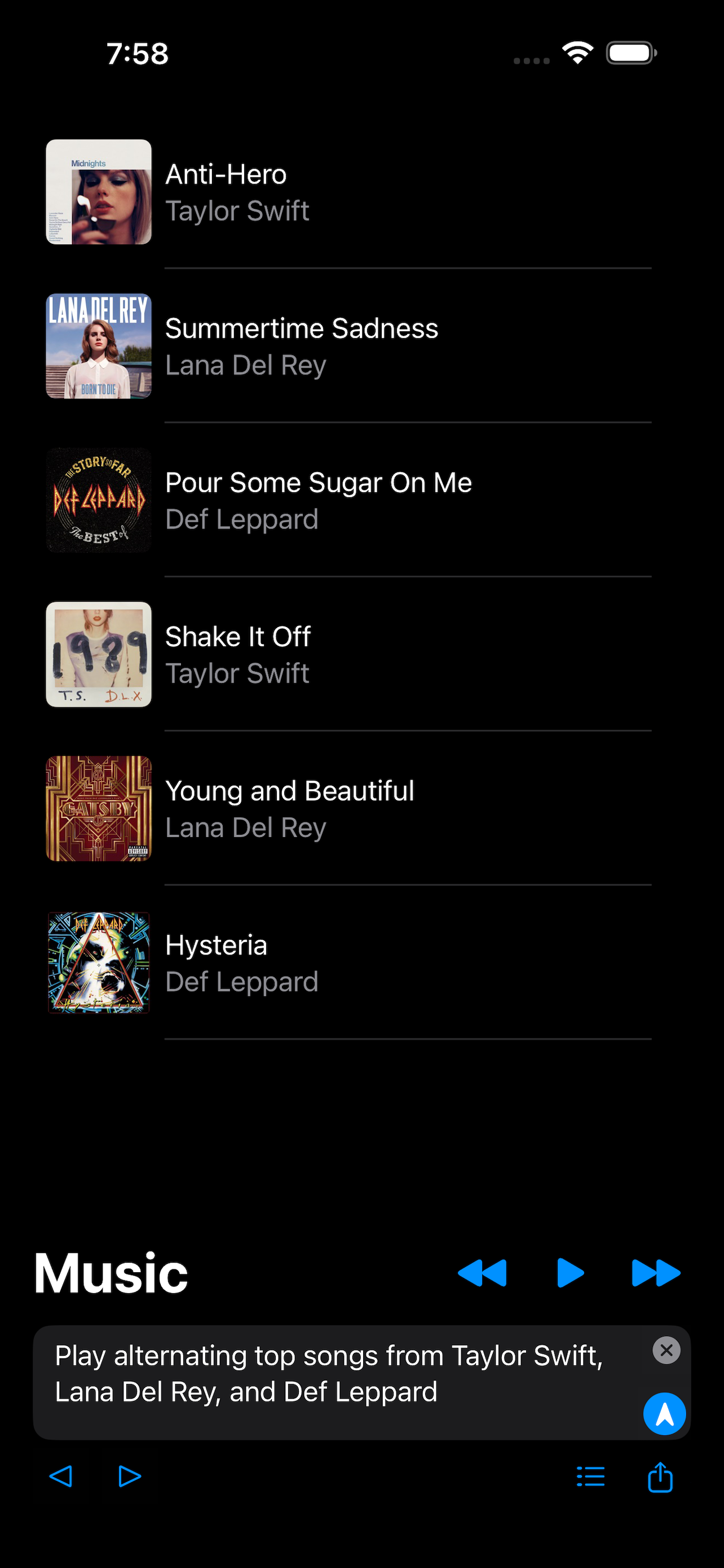 You can enter advanced music AI prompt commands like "Play alternating top songs from Taylor Swift, Lana Del Rey, and Sia" and the AI-Jukebox will automatically generate and play the instant song list.