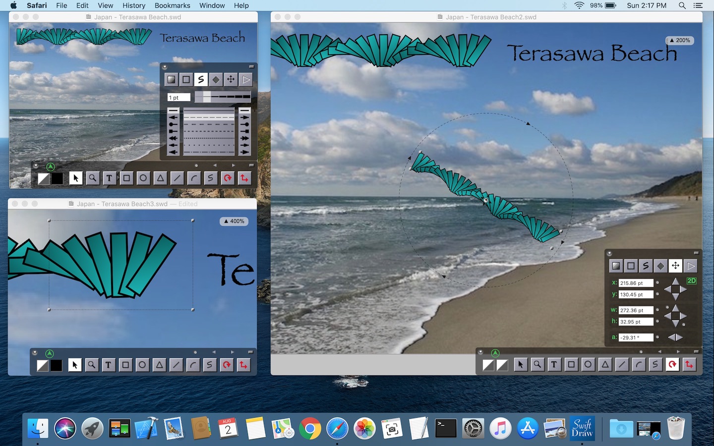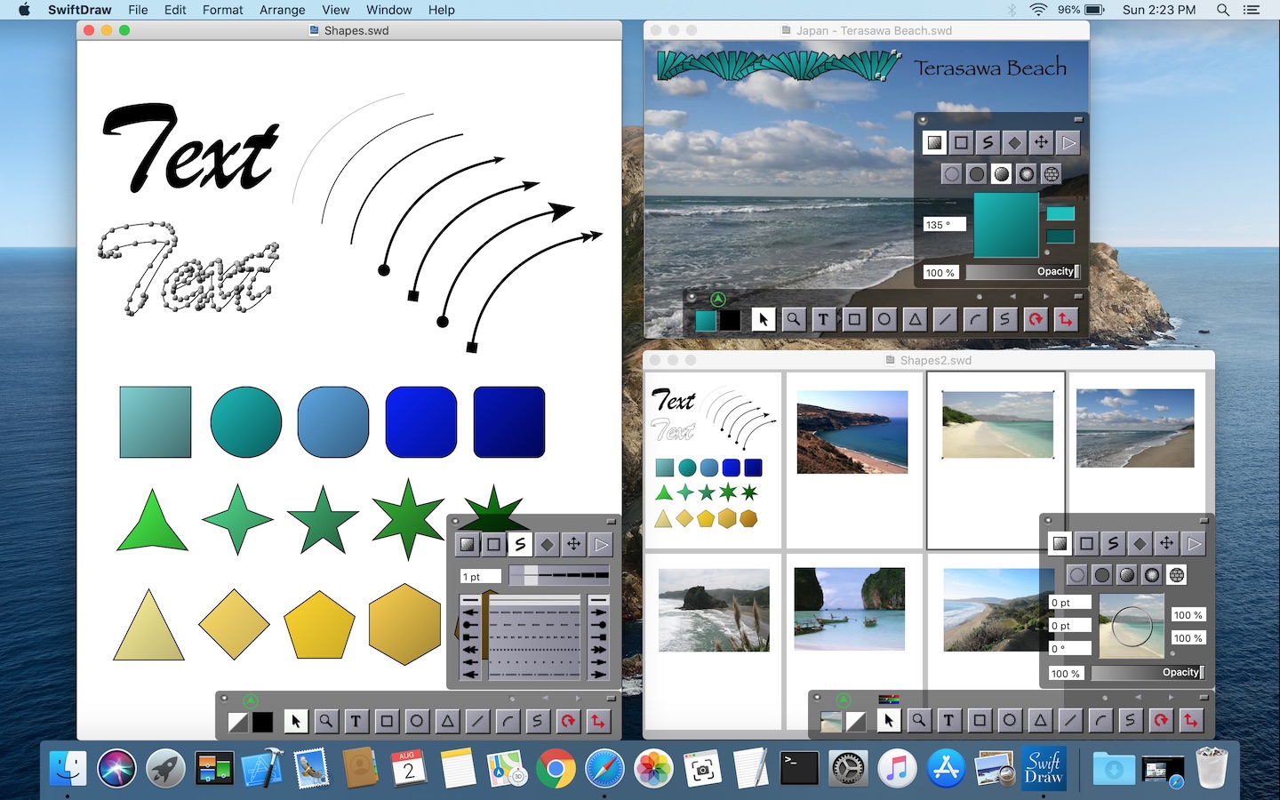 SwiftDraw is a powerful and easy-to-use graphics program for creating business graphics, diagrams, illustrations, layouts, advertisements, and presentations. The app lets you draw any object easily, including rectangles, ellipses, polygons, stars, arrows, arcs, lines, and Bezier paths. You can also drag and drop JPEG images directly into any page, and add text by simply clicking on a page and typing.